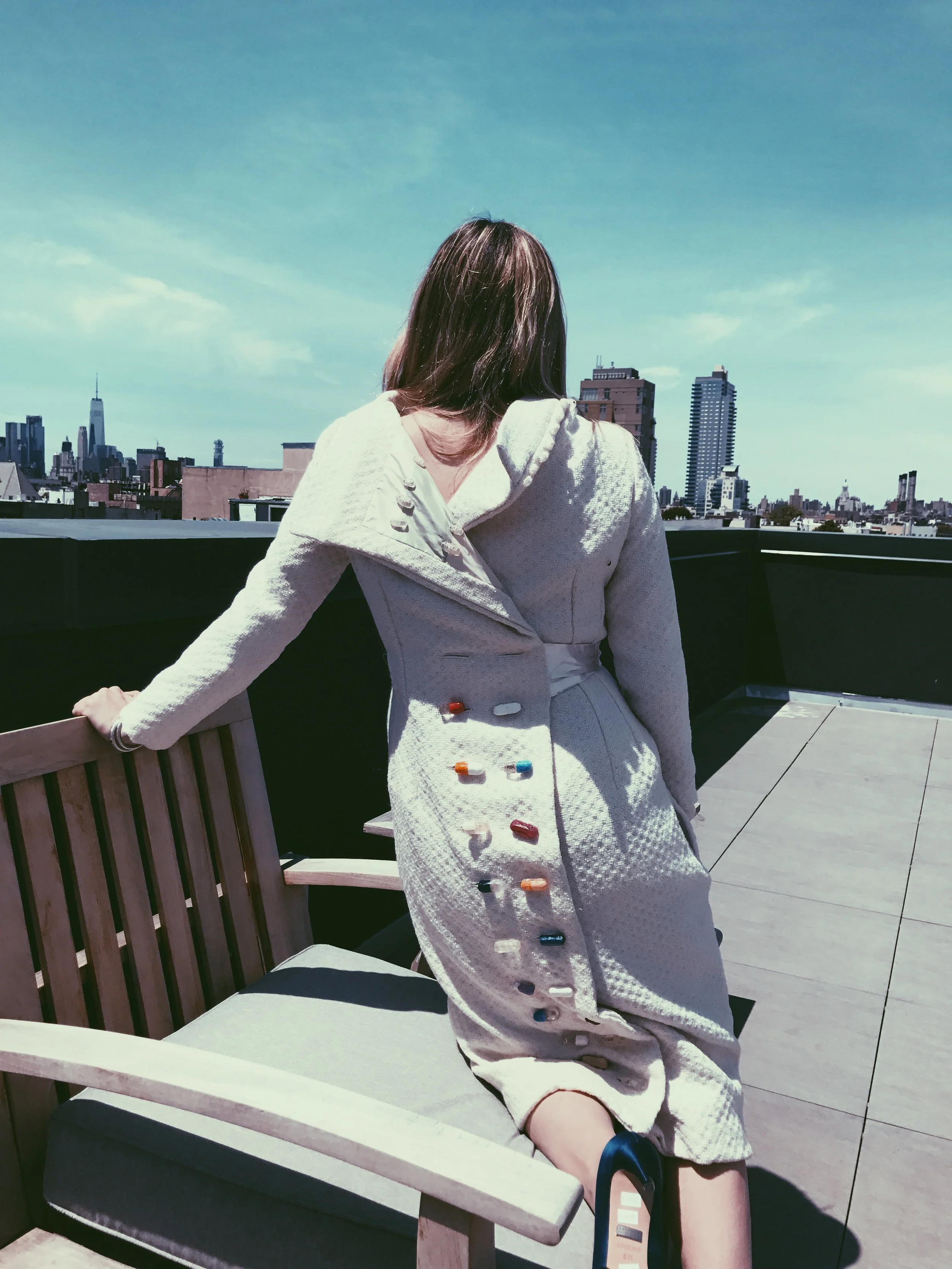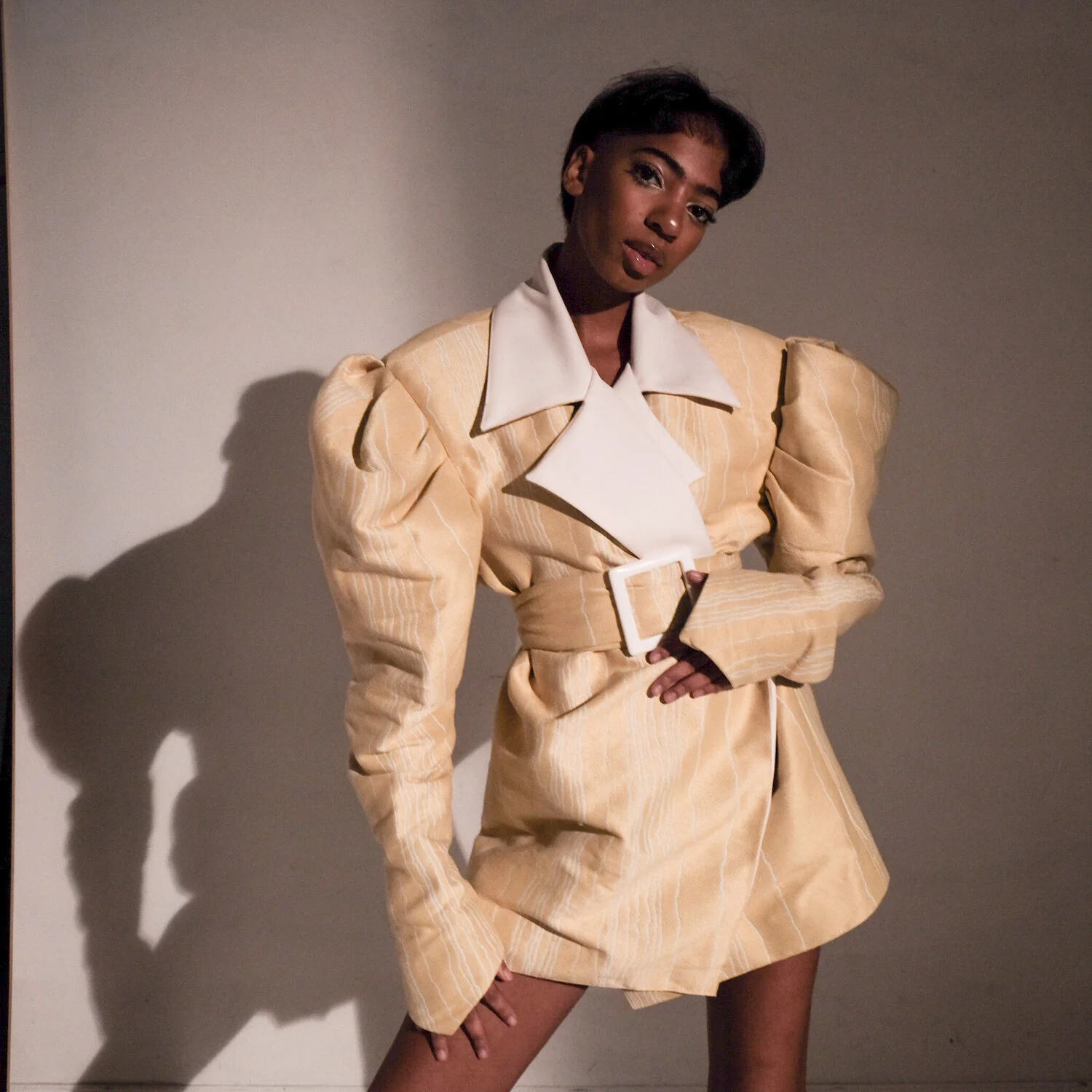 I started this project by building a large boxy-sculpture made simply out of cardboard. I tried to stay away from harsh triangles and super geometric shapes because it is so far from my personal style. I wanted my skirt to have movement and look like a wearable garment. After I draped my shape, I started draping the muslin to make something that wasn’t clearly from my shape. I initially cut open the top and played around with it but I really didn’t like how it looked and wasn’t finding anything interesting. I then flipped it to have the huge open bottom on the top and found something that I thought was really interesting. I really liked the way that bunching up the fabric to look like a bow looked and then built my skirt around that idea. Instead of going the purely geometric way, I found something that had movement and flow. Since my sculpture was so long the skirt was super long and i kept it that way since it fit with the idea of the bow. My skirt is very geometric and flat in the front and all the volume and intrigue is in the back. I wanted to make this dress as elegant as possible so I chose a white cotton that was a little shiny to emphasis the draping in the back. As I draped the skirt initally in muslin, it started to remind me of the silhouette of a wedding dress. I don’t know if it was simply because the muslin was close to white, but I decided to move the wedding dress idea further. I wanted to make it traditional yet so very not traditional in the sense that its a skirt and how harsh and modern the front was. The white fabric added in the juxtaposition of the front and the back.